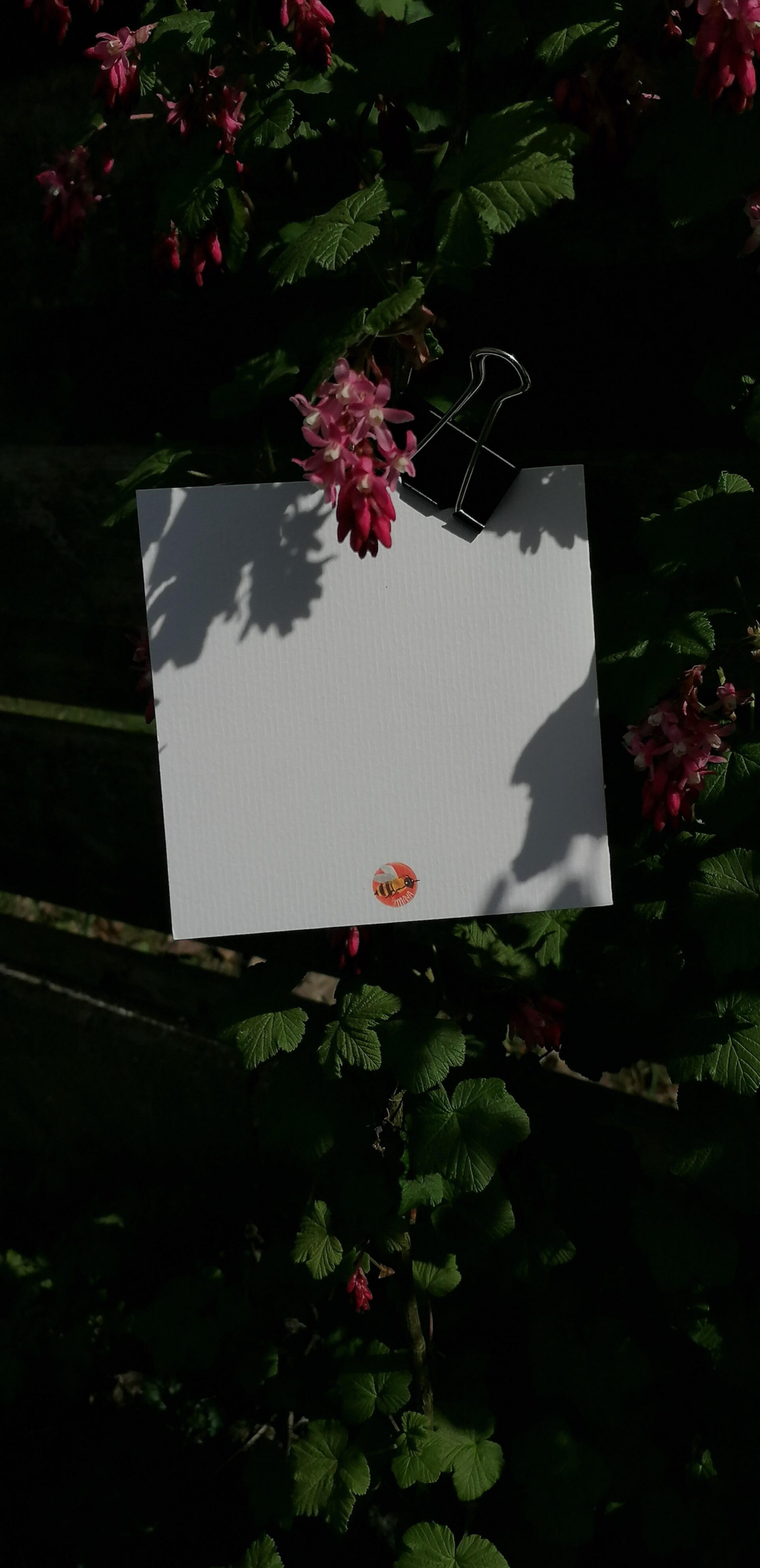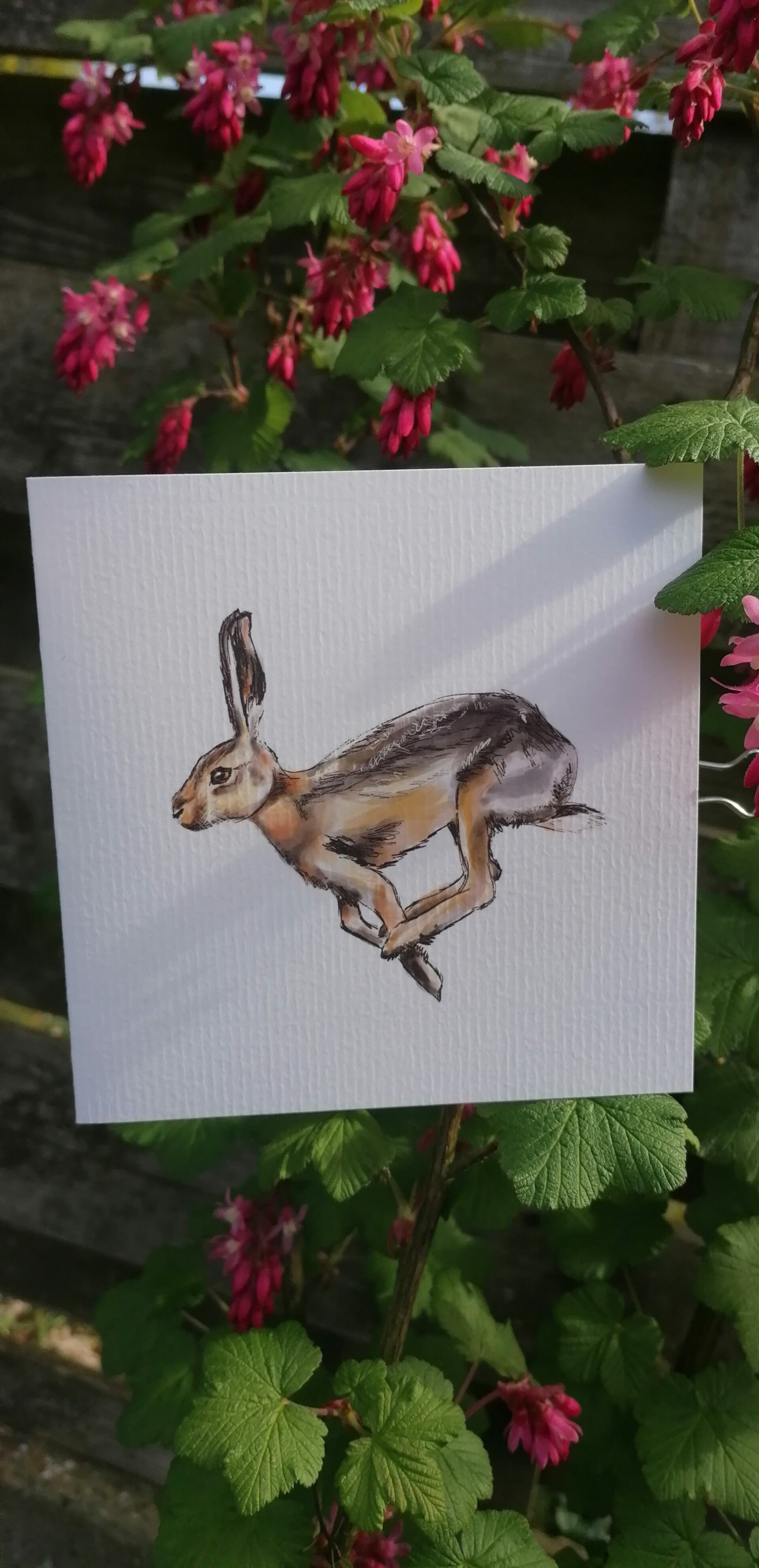 Dubbele wenskaart haas. 13,5x13,5 cm groot, gedrukt op Oud Hollands papier (voelbare lijnenstuctuur) inclusief kraft enveloppe (karton kleur).