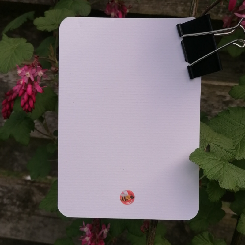 Enkele wenskaart met de afbeelding van een babykonijn in de draagdoek bij zijn ouder. A6 formaat met ronde hoekjes, gedrukt op Oud Hollands papier (lichte lijnenstructuur), inclusief enveloppe.