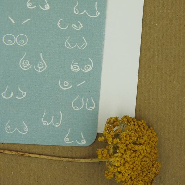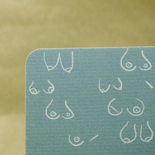 Enkele wenskaart Girlpower met de afbeelding van een variatie aan gezonde borsten, al dan niet na een operatie, op een aquakleurige achtergrond. A6 formaat met afgeronde hoekjes, gedrukt op Oud Hollands papier (voelbare lijnenstructuur). Inclusief witte enveloppe.