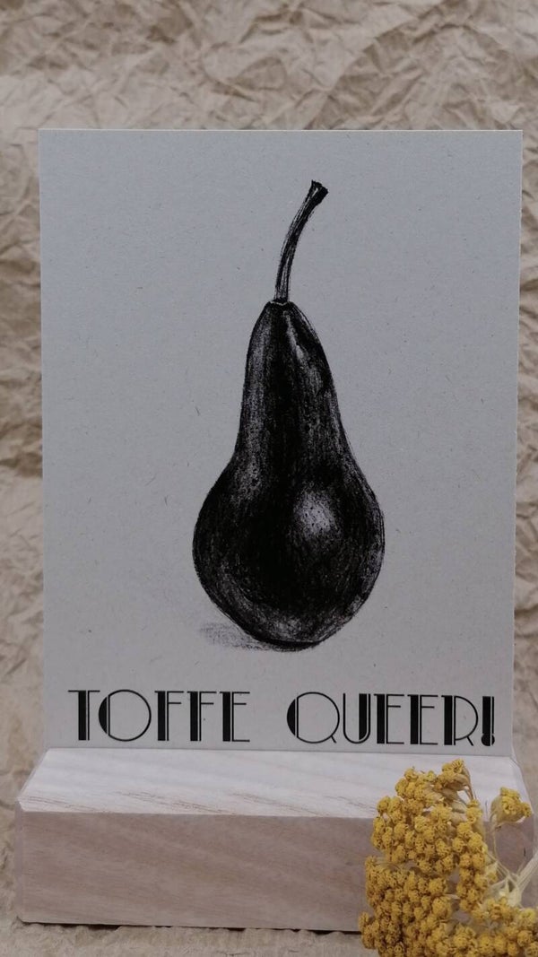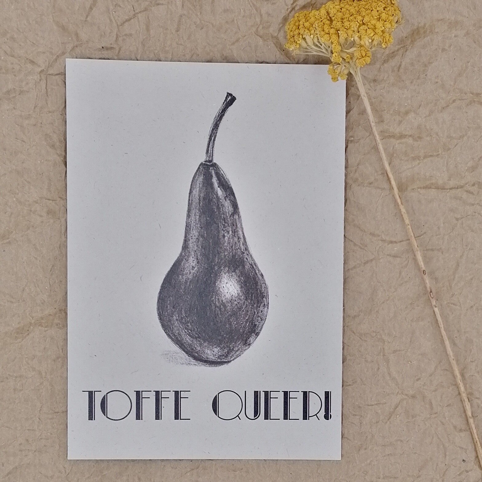 Enkele wenskaart 'toffe queer' A6 formaat inclusief enveloppe. De illustratie van een peer is afgedrukt op ecologisch papier. Dit papier heeft een lichte zandkleur en is goed beschrijfbaar. De enveloppe is van dezelfde papiersoort.